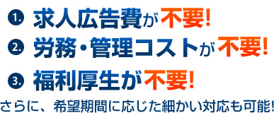 短期・長期をはじめ、早急の募集、1~5名位、要資格保持者など、様々な派遣可能なスタッフをそろえておりますので、